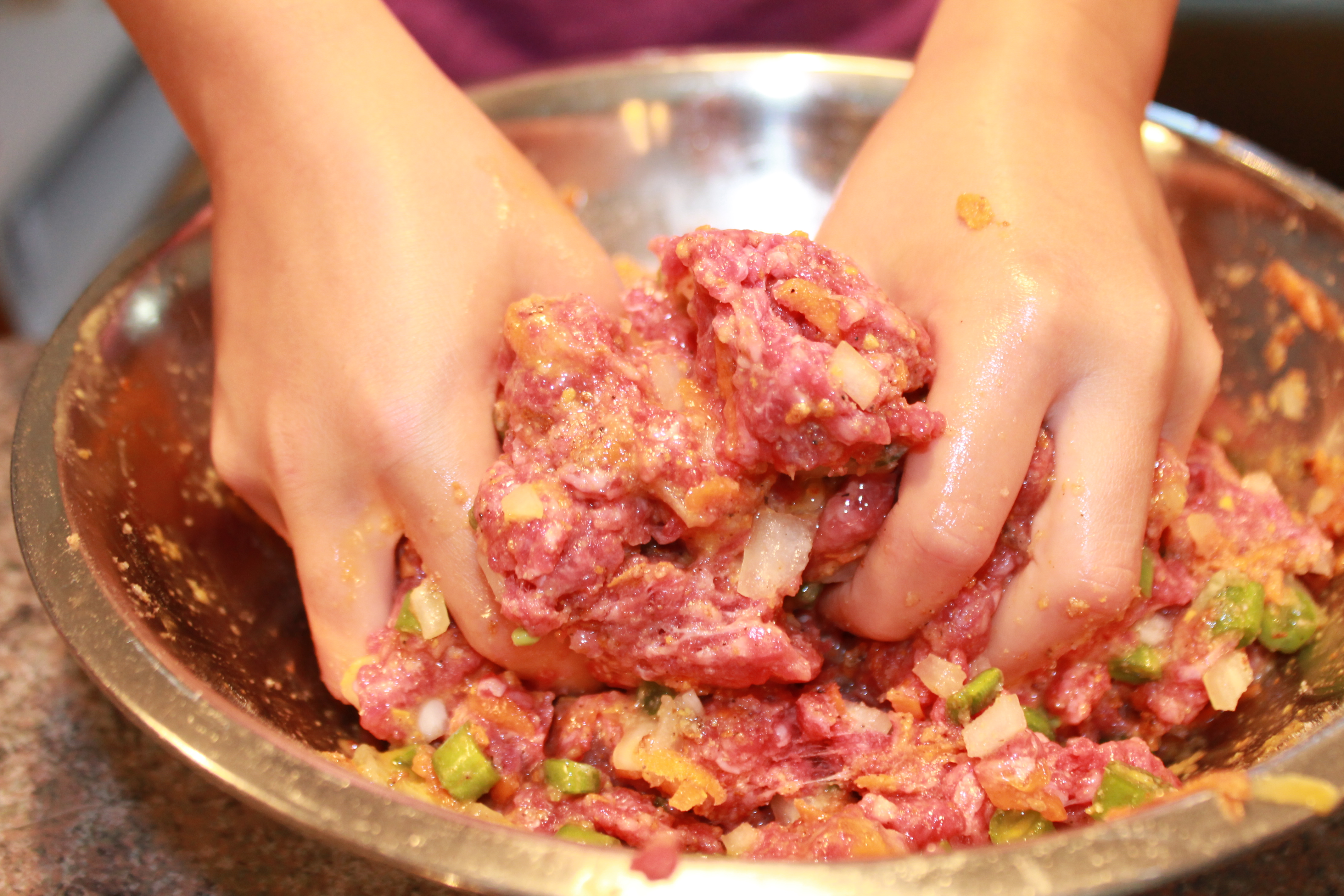 Je ne sais pas si ce phénomène est propre à ma maisonnée ou si c’est pareil chez vous, mais mes filles ADORENT mélanger la viande hachée les mains nues (préalablement lavées, bien sûr). Il y a un aura de magie autour de cette tâche. Écraser la viande qui s’échappe de leurs doigts, ils le feraient durant des heures :
