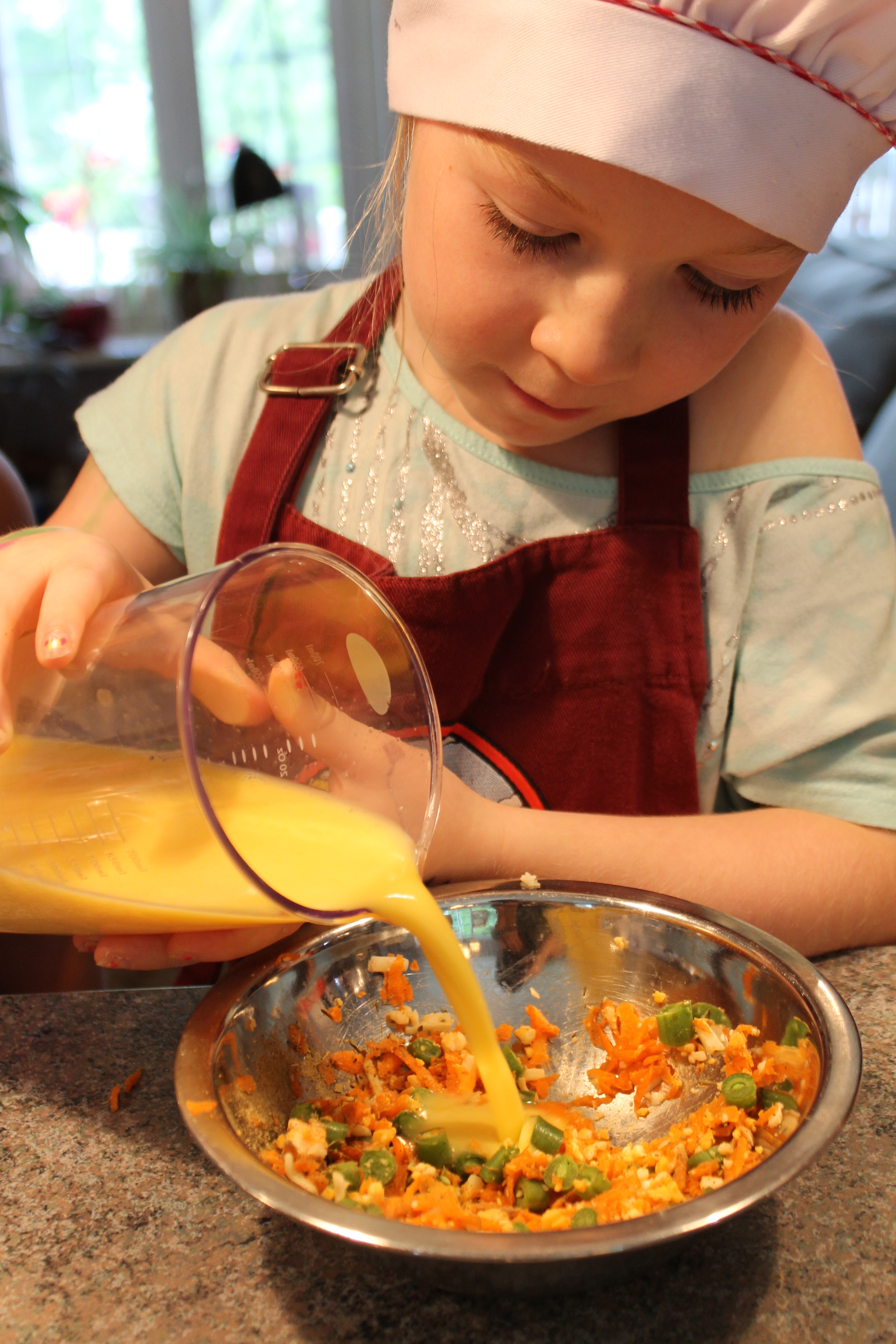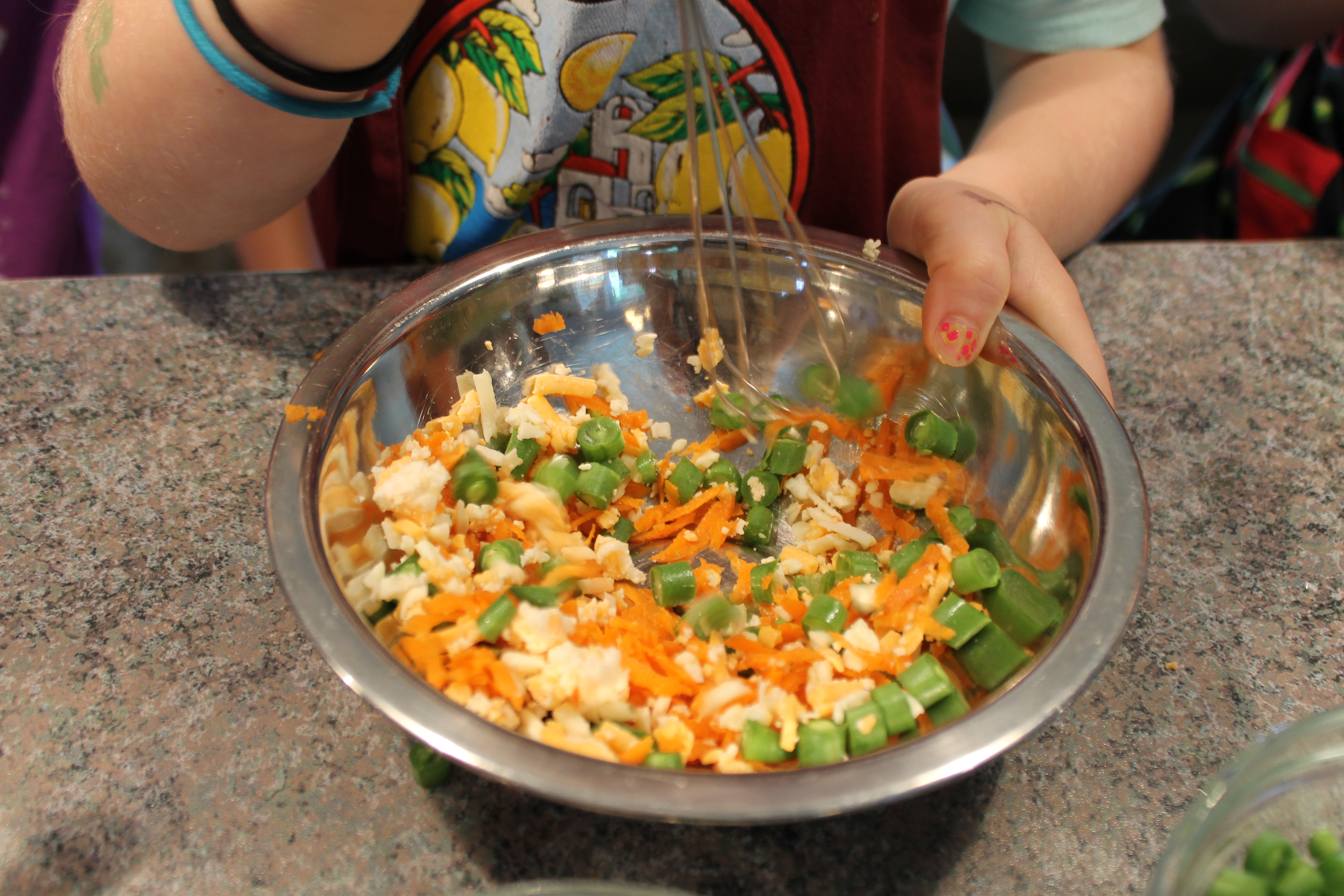 Ici, je leur ai préparé des haricots, des carottes râpées et de l’oignon mais vous pouvez mettre n’importe quel légume, en autant qu’il soit coupé en petits cubes ou râpé car la cuisson d’une omelette dépasse rarement les 5 minutes. Si les morceaux de légumes sont trop gros, ils n’auront pas le temps de cuire convenablement.
